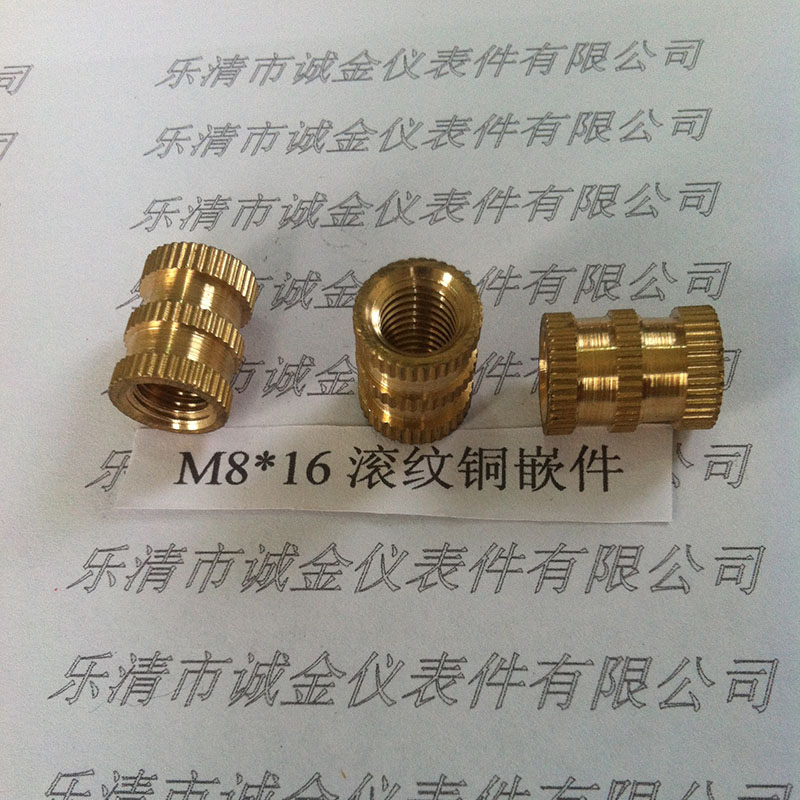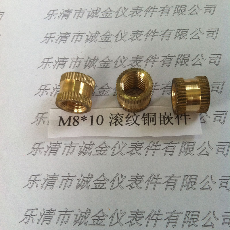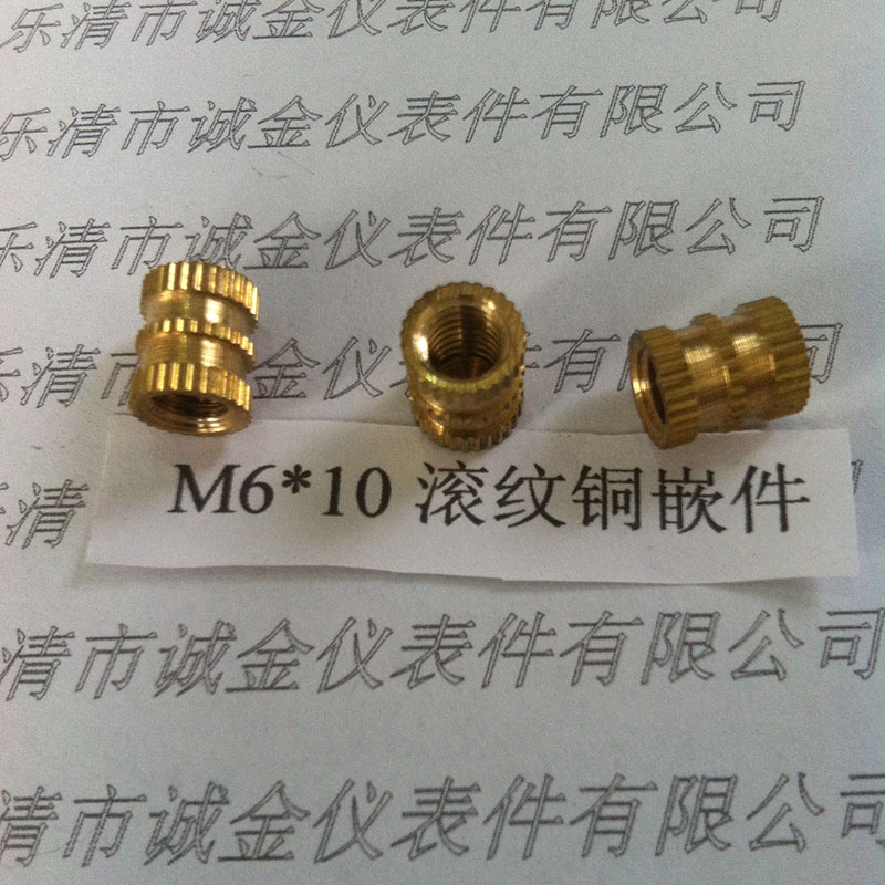 铜嵌件:又名铜镶件、铜螺母,一般用黄铜材质制造。滚花、六角螺母或者与其它螺栓匹配的不同样式的铜镶件在我们生活中比较常见。铜镶件通常用于导热、导电、防锈及高温环境下使用是因为其具有不易生锈、防腐蚀、易导热以及导电性能极强等优点。例如用于电器开关、阀门及水龙头这类设备。铜嵌件件的另一个用途便是注塑,即将其加热后直接嵌入塑料件里面,或者是将其直接加到模具注塑当中。